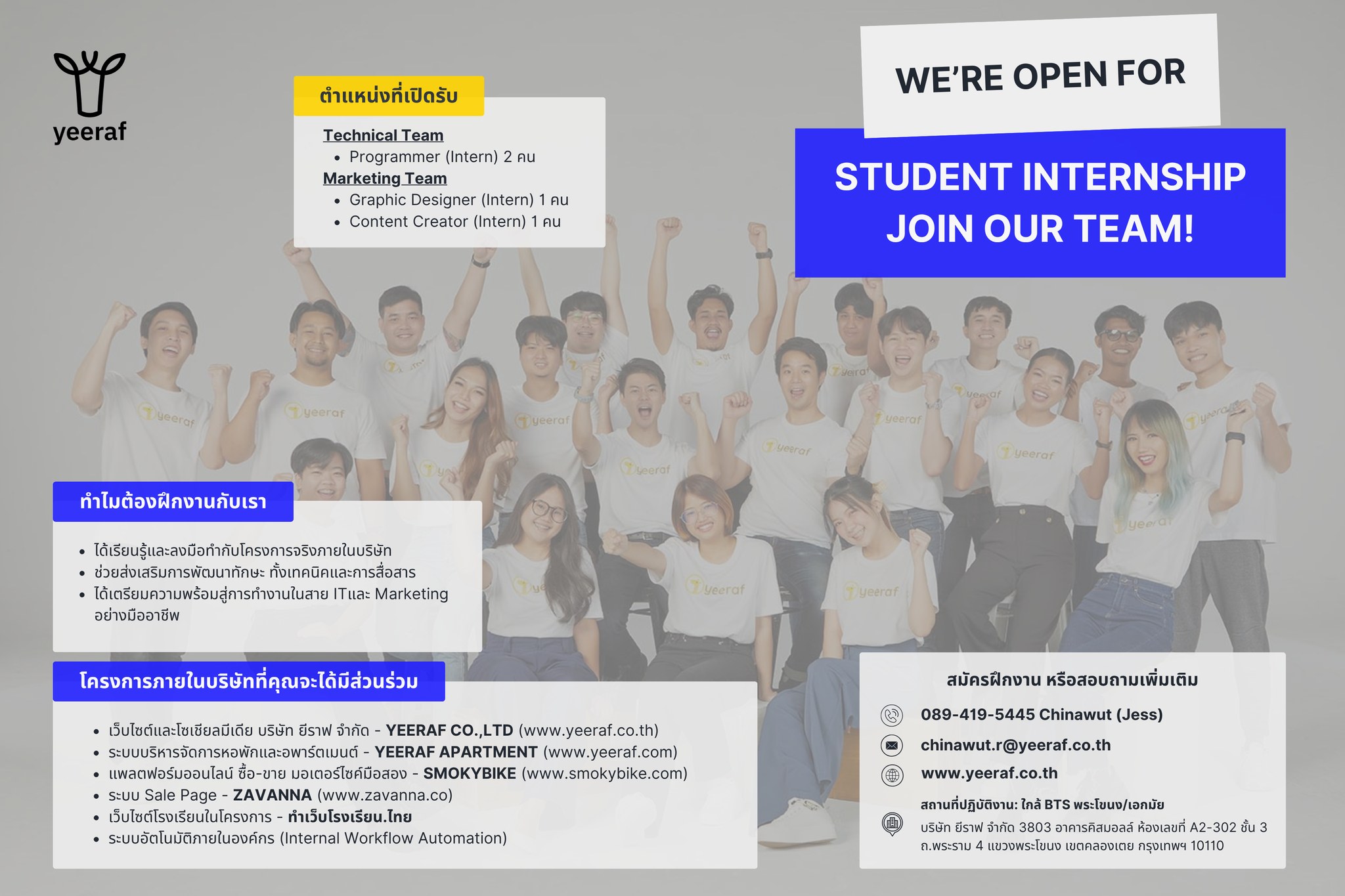 บริษัท ยีราฟ จำกัด เปิดรับนักศึกษาฝึกงานครับ.หากคุณกำลังมองหาโครงการฝึกงาน:– ได้เรียนรู้และลงมือทำกับโครงการจริงภายในบริษัท– ช่วยส่งเสริมการพัฒนาทักษะ ทั้งเทคนิคและการสื่อสาร– ได้เตรียมความพร้อมสู่การทำงานในสาย ITและ Marketing